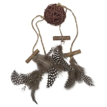 - Ratan, dřevo a peří jsou šetrné k tlapkám i zubům a dobře se drží v tlamičce.